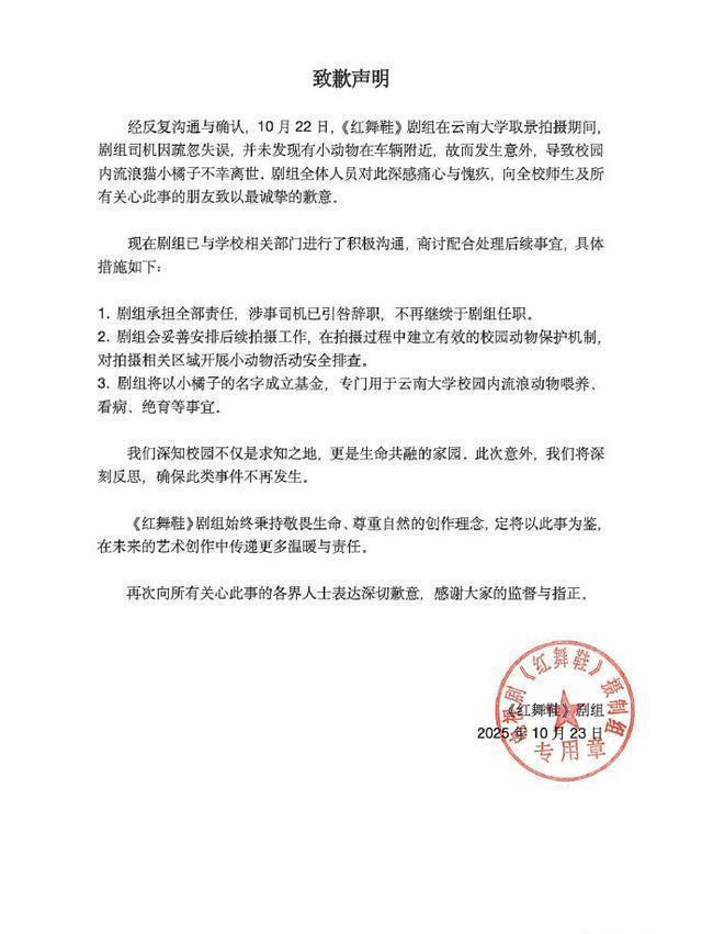 意识到自己玩脱的剧组,连夜发布道歉声明,不过依旧是避重就轻,只是说小猫突然出现在了车辆旁边,但对自己在学校人行道上开快车的行为只字不提,要知道这条路有非常清晰的限速提醒,不仅如此,路口还有路障石墩,所以小猫才会经常在这条路上活动,步行的学生是伤不到小猫的,也就是说,剧组的人为了开快车,故意挪开了路障。